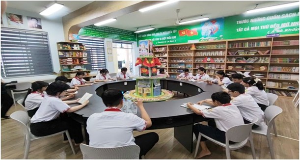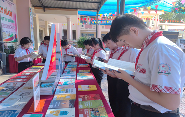 Học sinh trường THCS Tân Xuân tham gia đọc sáchtại buổi trưng bày sách hưởng ứng “Tuần lễ học tập suốt đời năm 2025”
